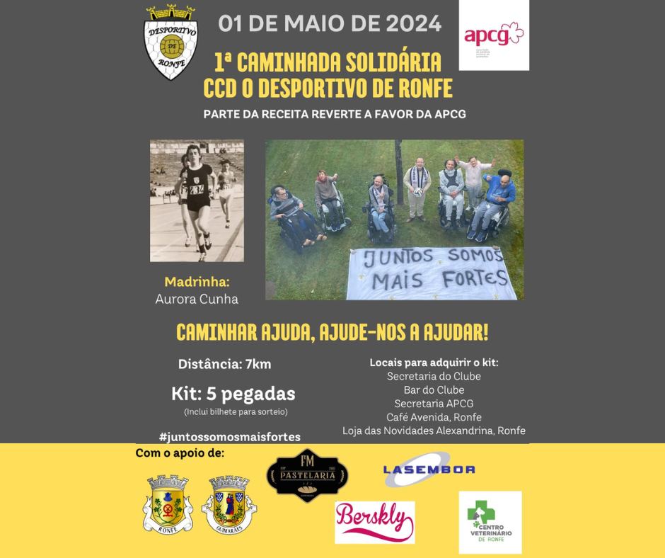 O Desportivo de Ronfe organiza, no próximo dia 1 de maio, a 1ª Caminhada Solidária. Um evento que terá como madrinha Aurora Cunha e que permitirá ajudar a Associação Paralisia Cerebral de Guimarães (APCG) com parte da receita.